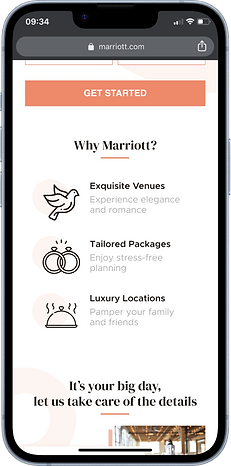 Building on the approved moodboard and selected layout, I designed a high-fidelity mockup for Marriott’s Weddings landing page. The page guided users through their offerings, showcased real wedding inspiration, and provided clear entry points to begin planning their own event. The result was a cohesive and visually engaging experience that aligned with the brand and user goals.
